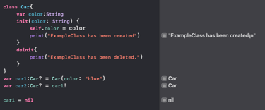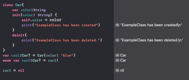 If car2 is defined as weak, it creates a weak reference. When car1 is set to nil, the deinit function is triggered.