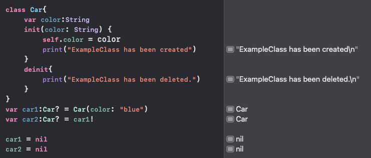 If car2 also becomes nil, the reference count managed by ARC drops to 0, triggering the deinit function.